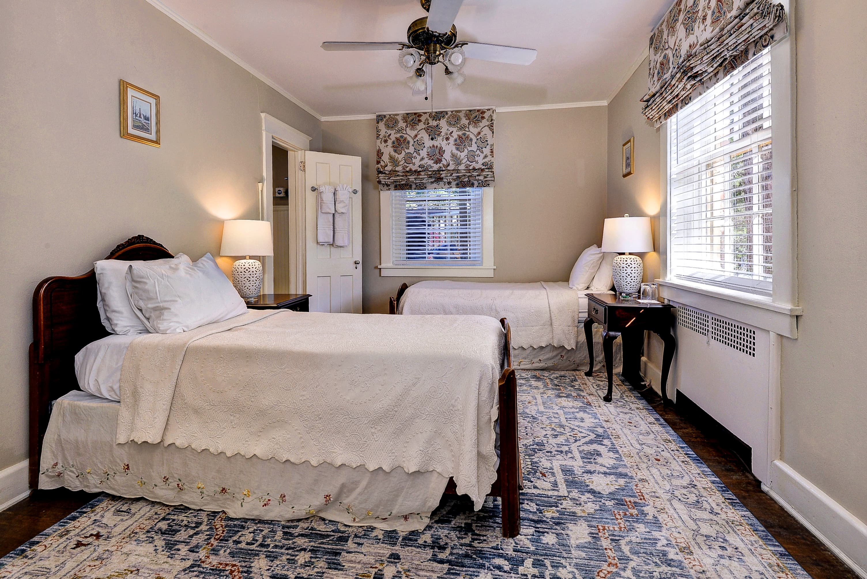Four posted queen bed with comfortable lounge chair, ceiling fan and closet. Bathroom with shower. Optionally a two-room suite on the second floor. See William & Mary Rooms.