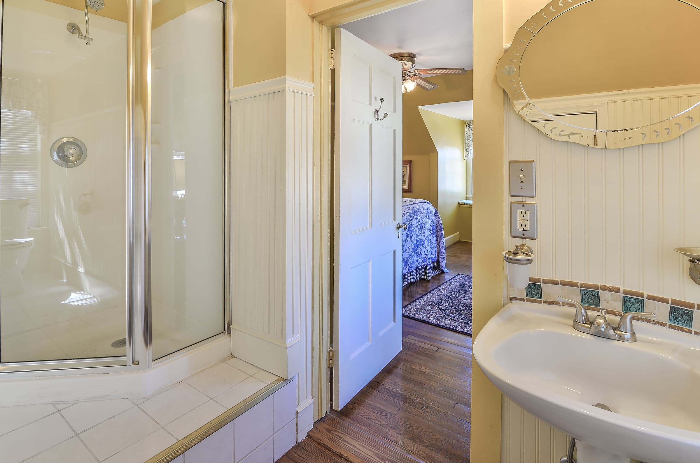This airy, spacious room is designed as inventively and creatively as if conceived by Mr. Jefferson himself. The queen size bed, window alcove, and two-level bath create an enticing charm. A small sofa provides a place to relax after a long day of touring Jefferson's beloved town.