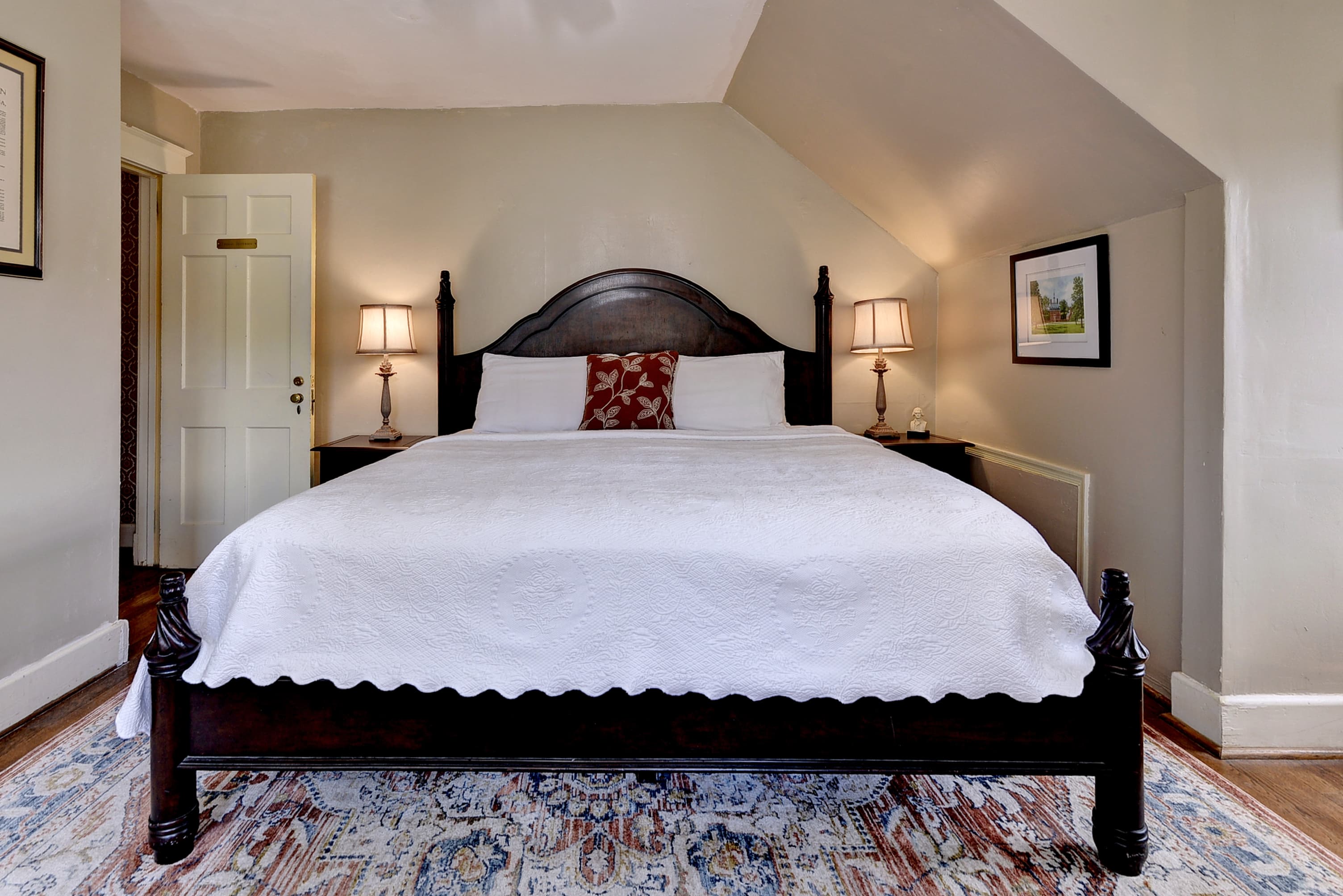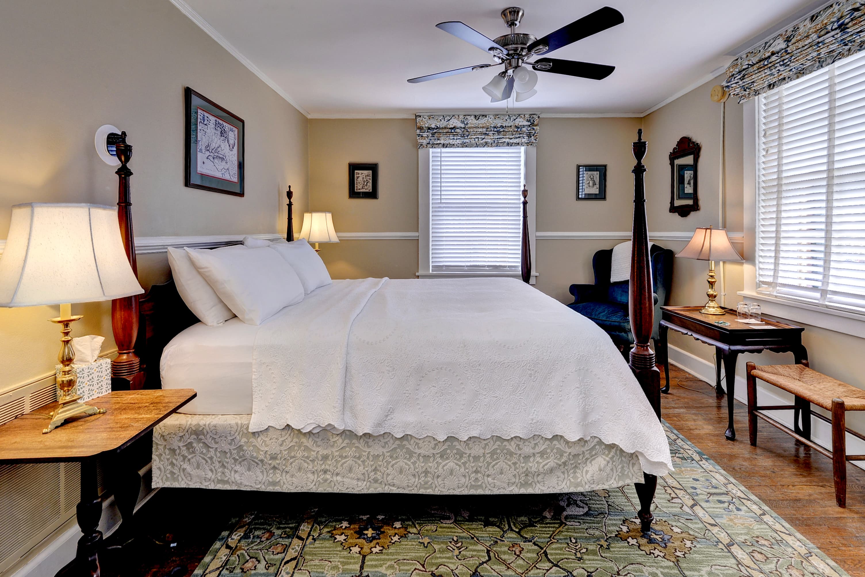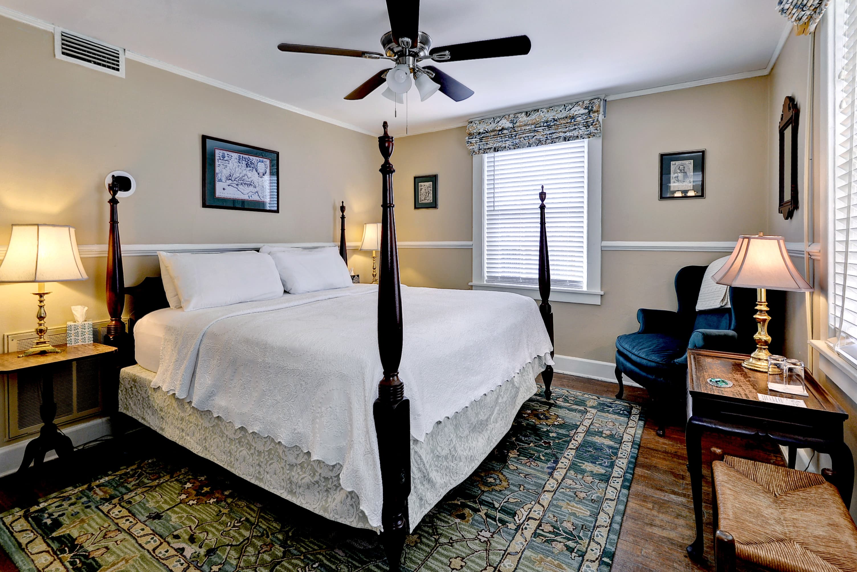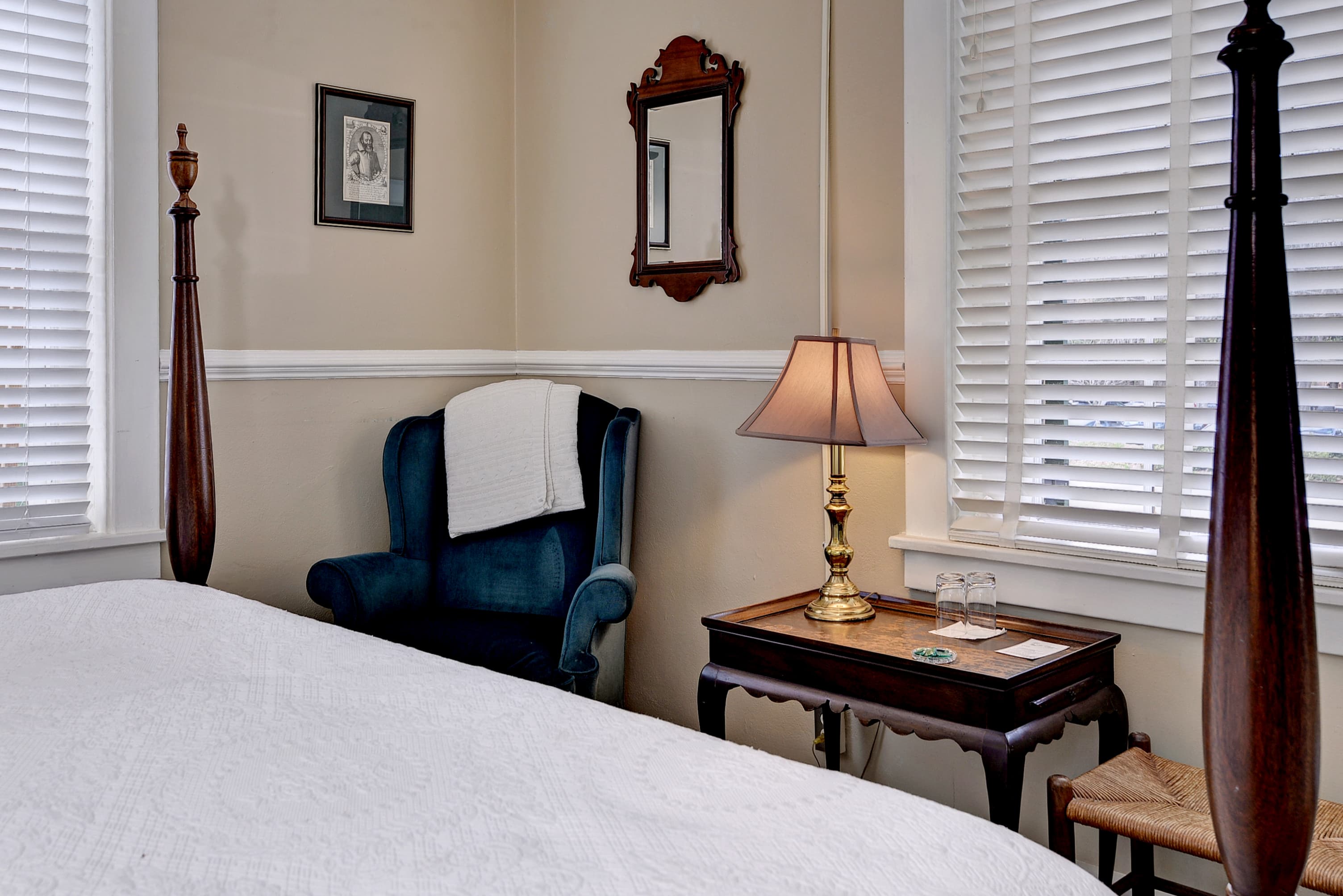 Tucked into a quiet corner of the house, this charming first floor room features a queen size, four-poster bed evoking early American atmosphere and peaceful refuge. The William Lee Room offers a bed chamber with a fabric backdrop and large bathroom with a tub and shower.