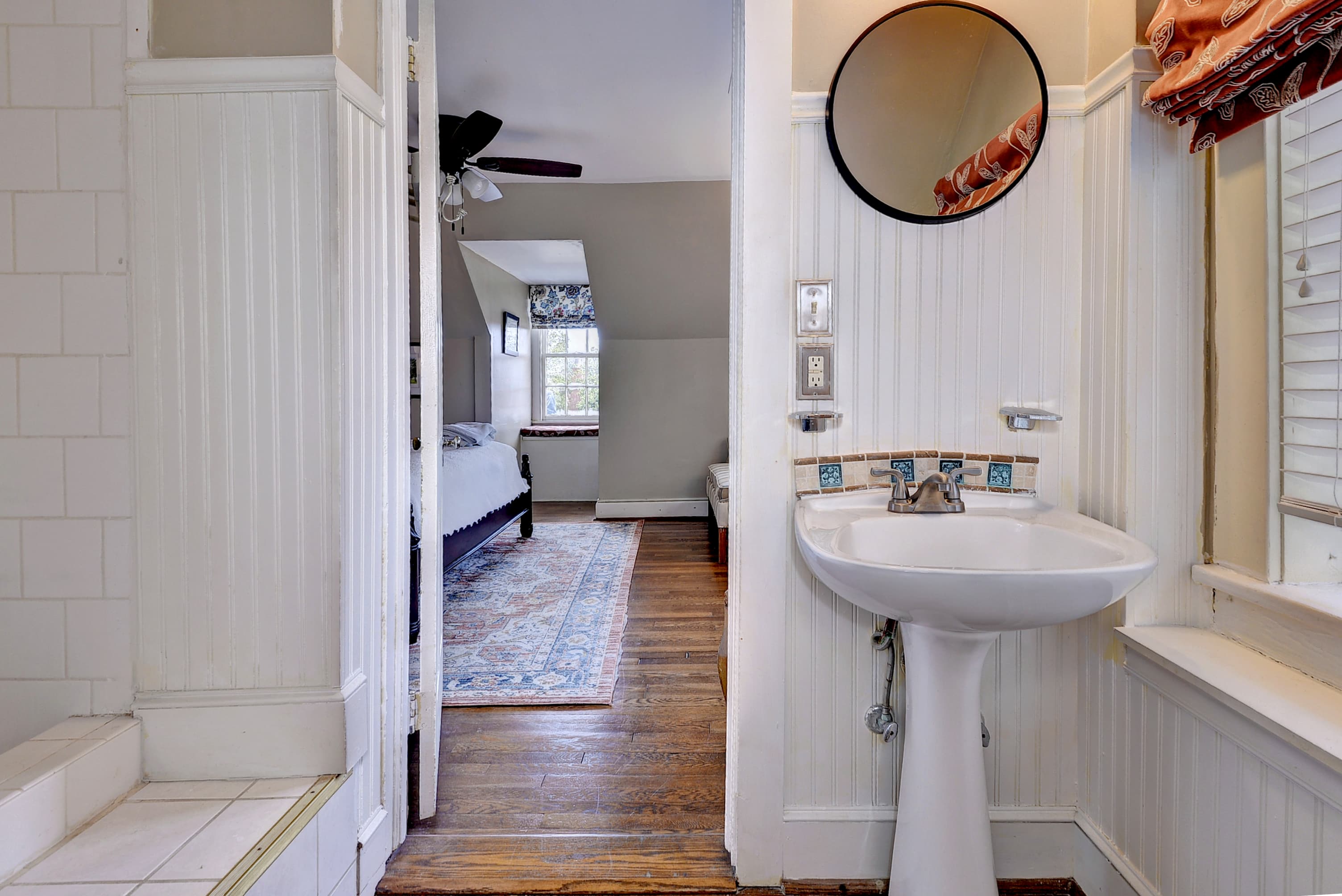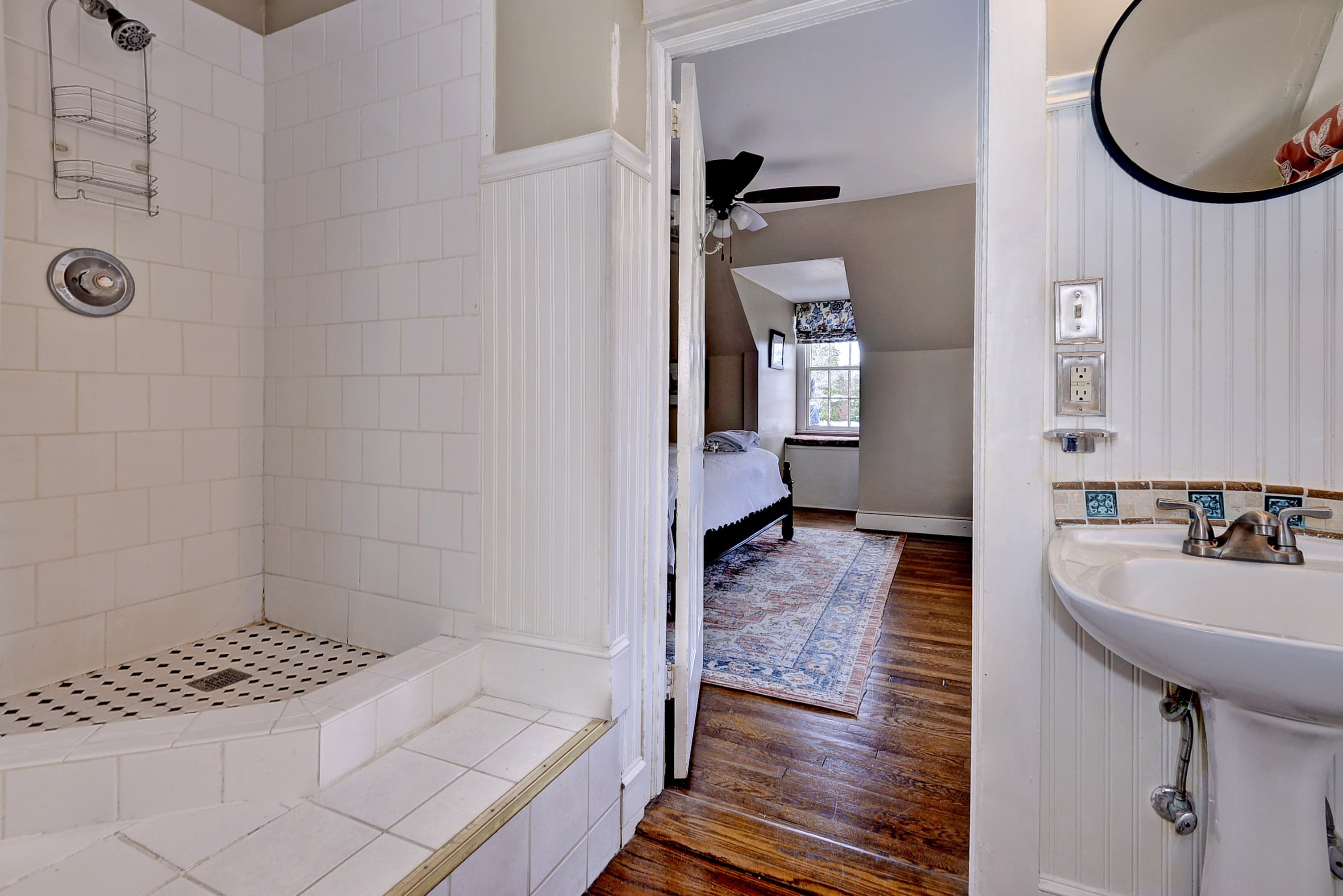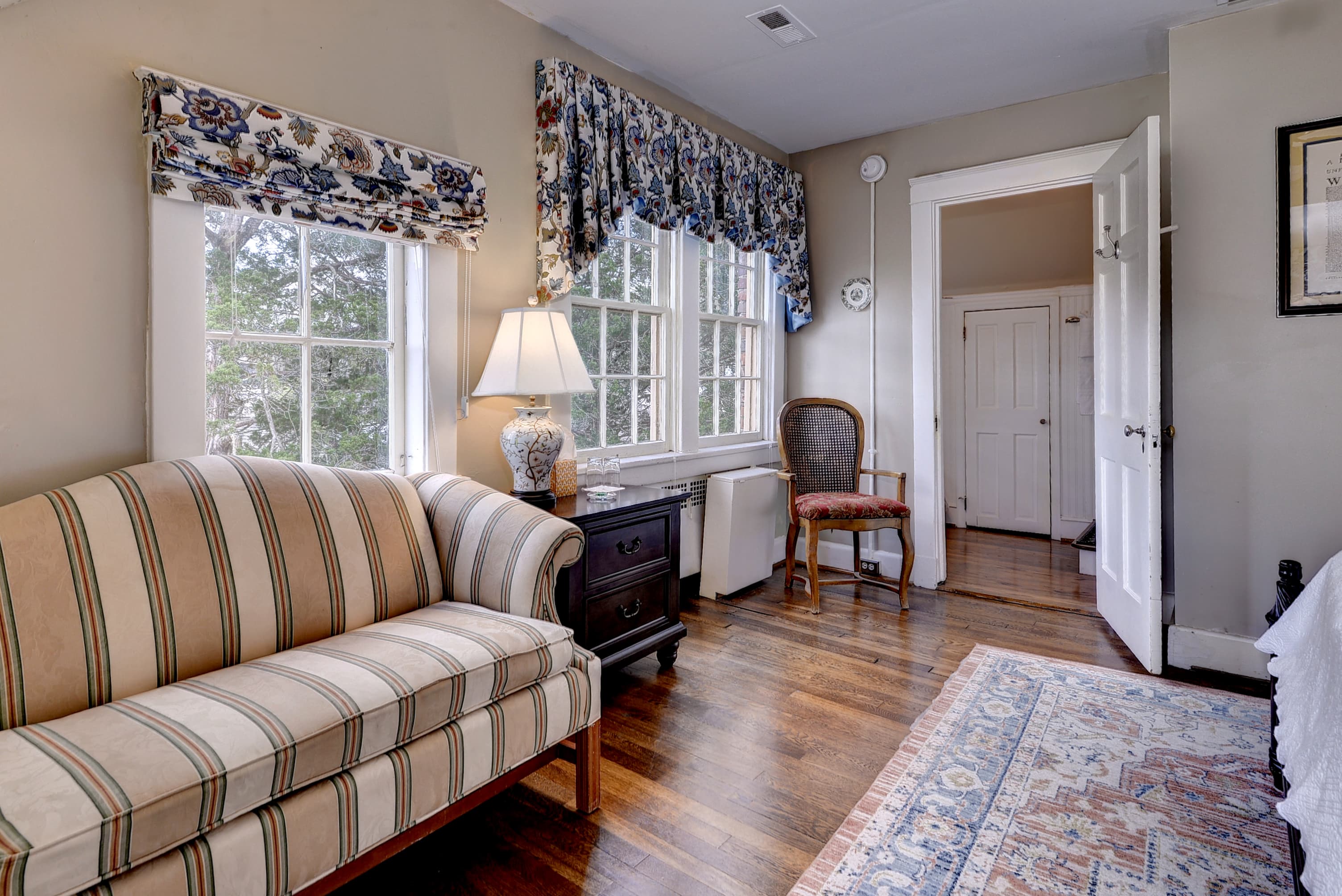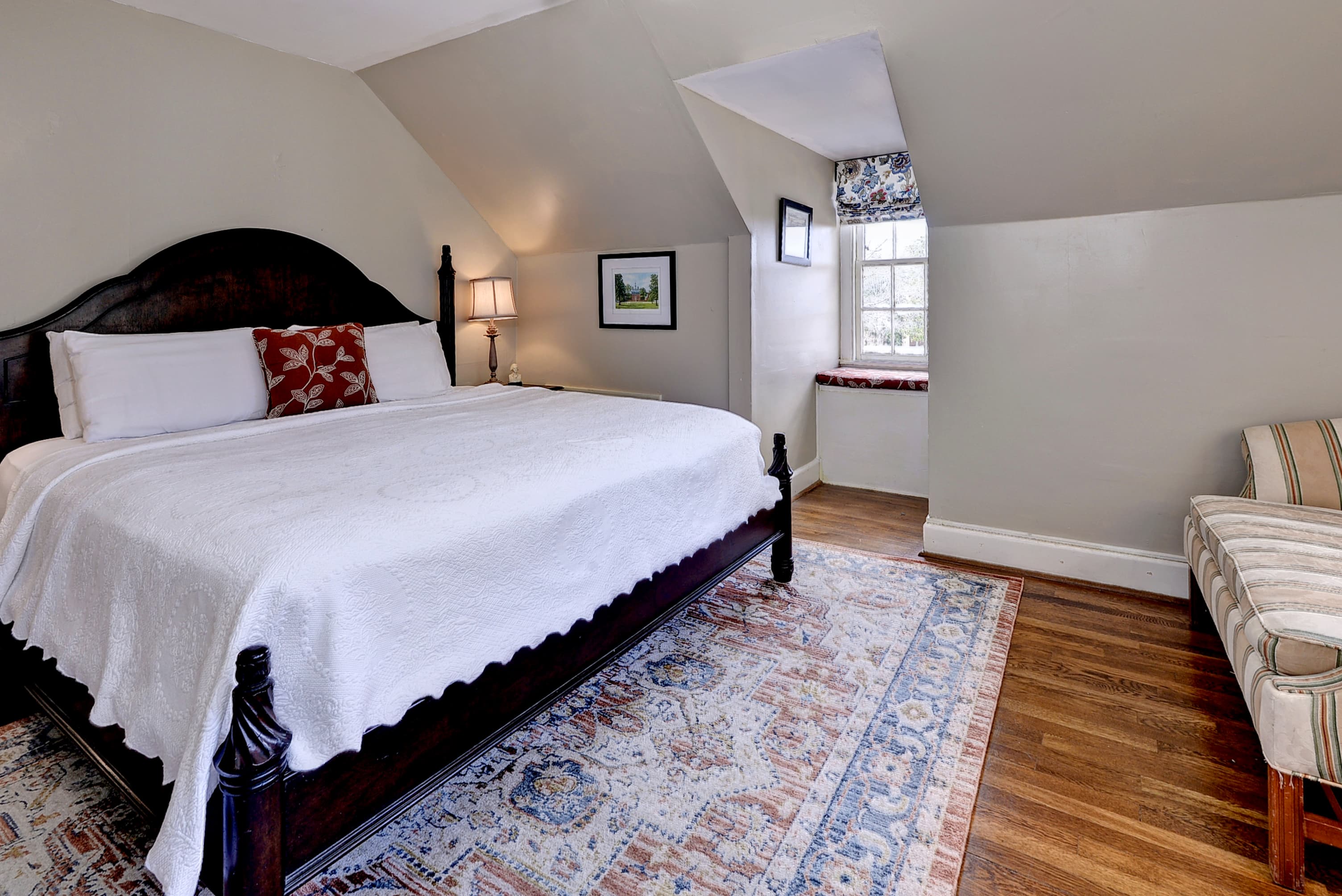 Tucked into a quiet corner of the house, this charming first floor room features a queen size, four-poster bed evoking early American atmosphere and peaceful refuge. The William Lee Room offers a bed chamber with a fabric backdrop and large bathroom with a tub and shower.